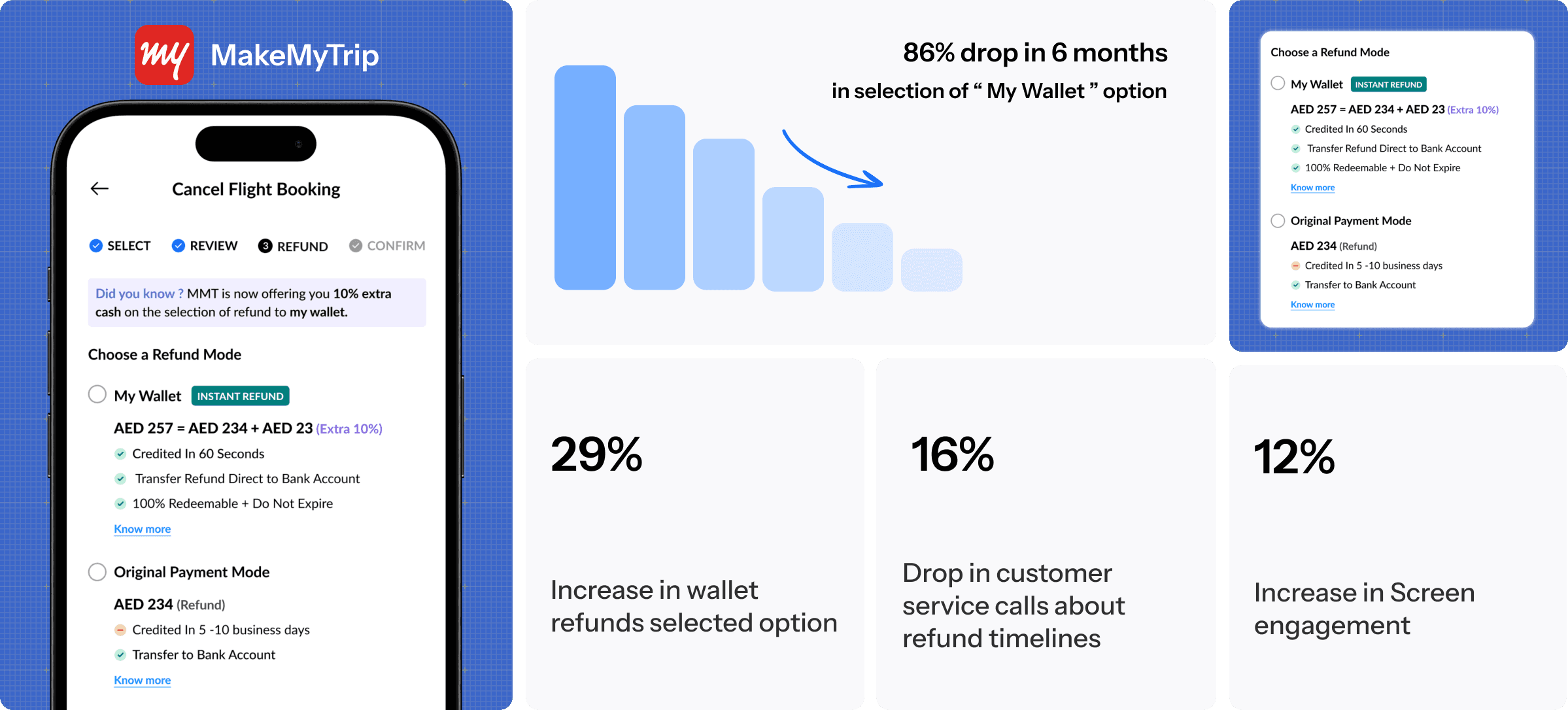 Designing for user behaviour at MakeMyTrip increasing user adoption for "My Wallet button" and reduced refund query calls by 16% for 20k+ travellers