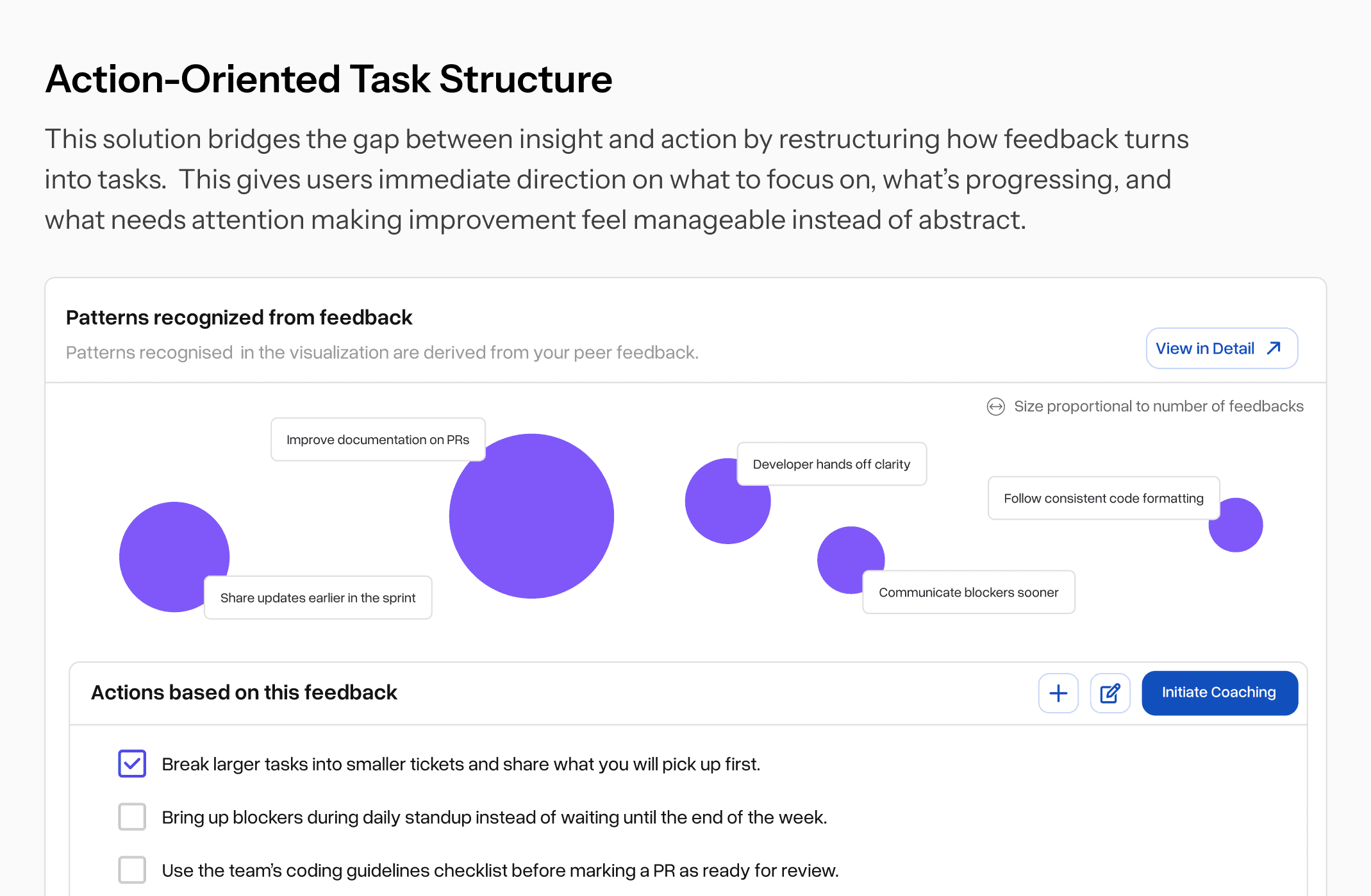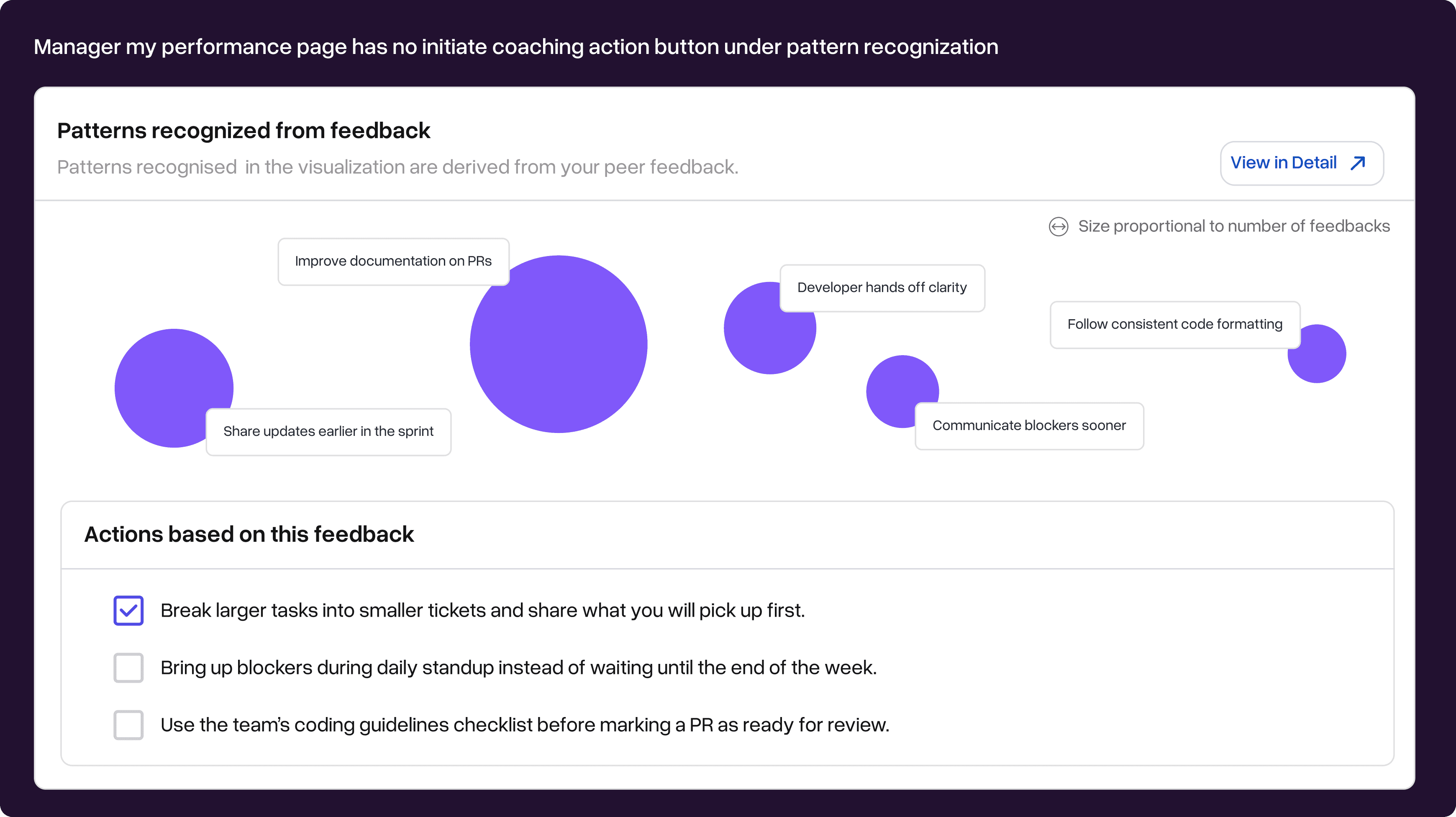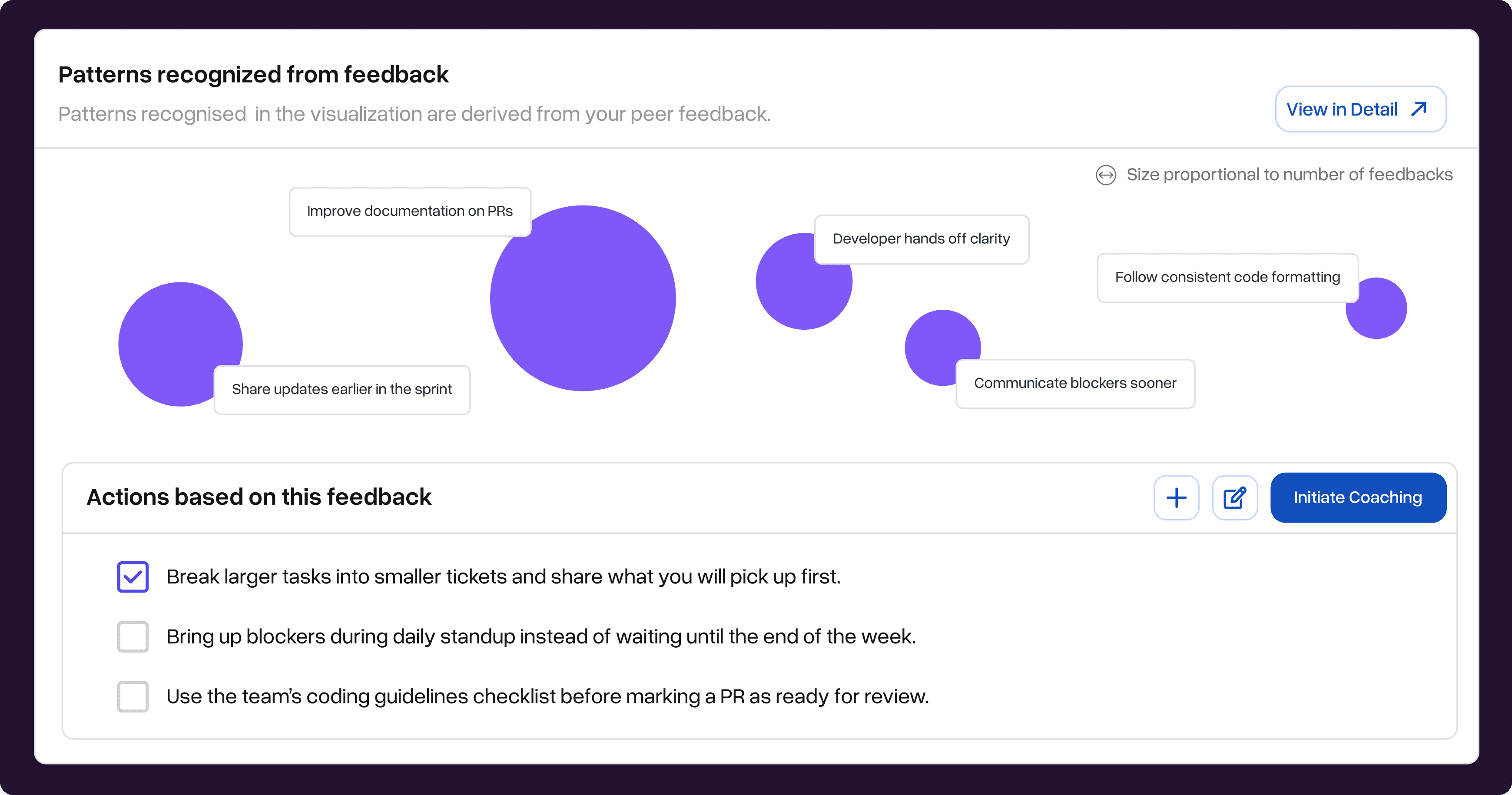 If an engineer notices a recurring pattern on their My Performance page and wants guidance, they can kick off a coaching request straight from that pattern. Likewise, every suggestion on the homepage has an “Initiate Coaching” button so when someone sees a recommendation and isn’t sure what to do, they can request coaching right then and there. This makes help feel timely and normal, not something you wait for until review season