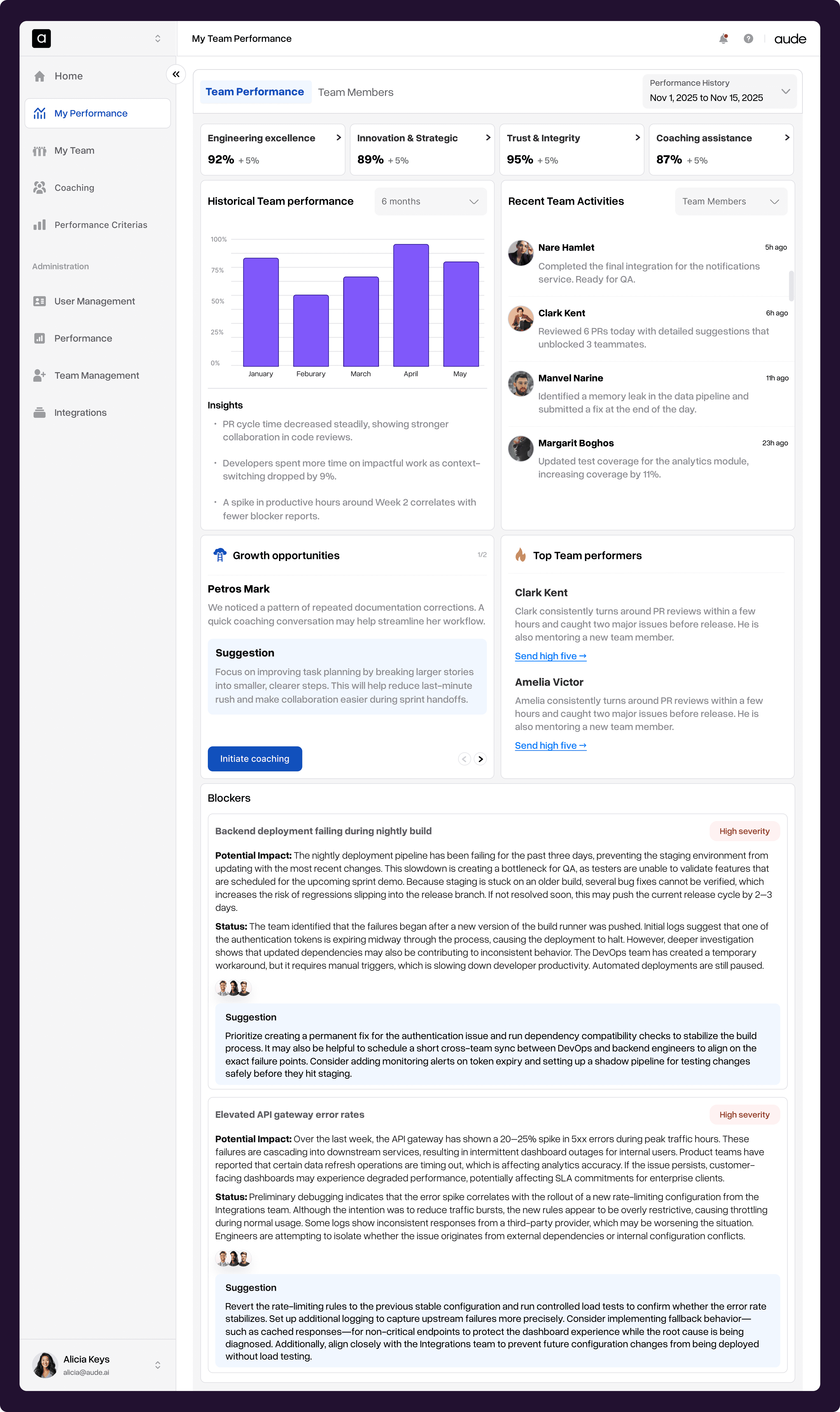 Aude.ai is a B2B SaaS platform that integrates with Slack, GitHub, Confluence and Jira to generate AI-powered engineering performance insights, surfacing patterns in collaboration, communication, and delivery.