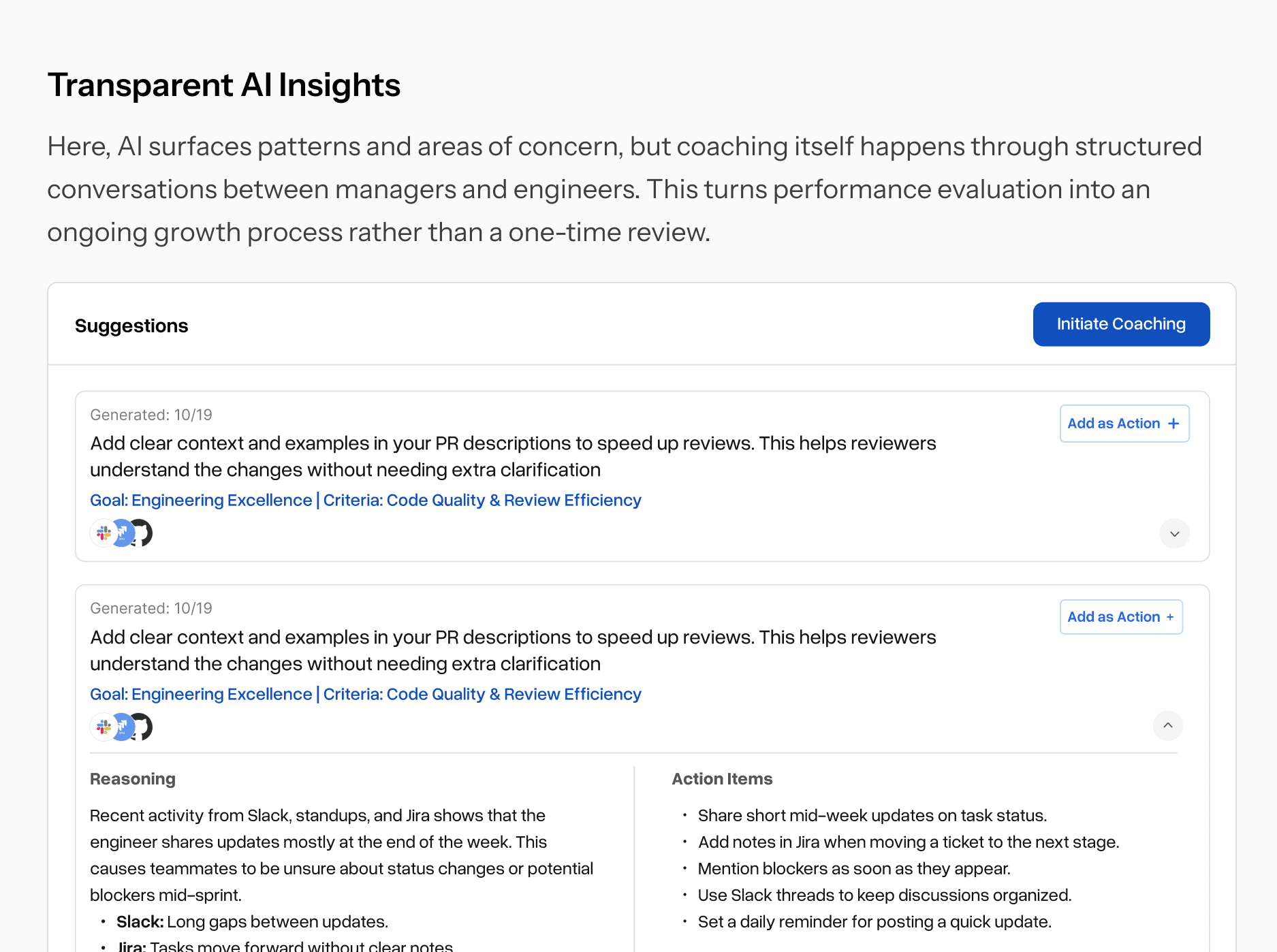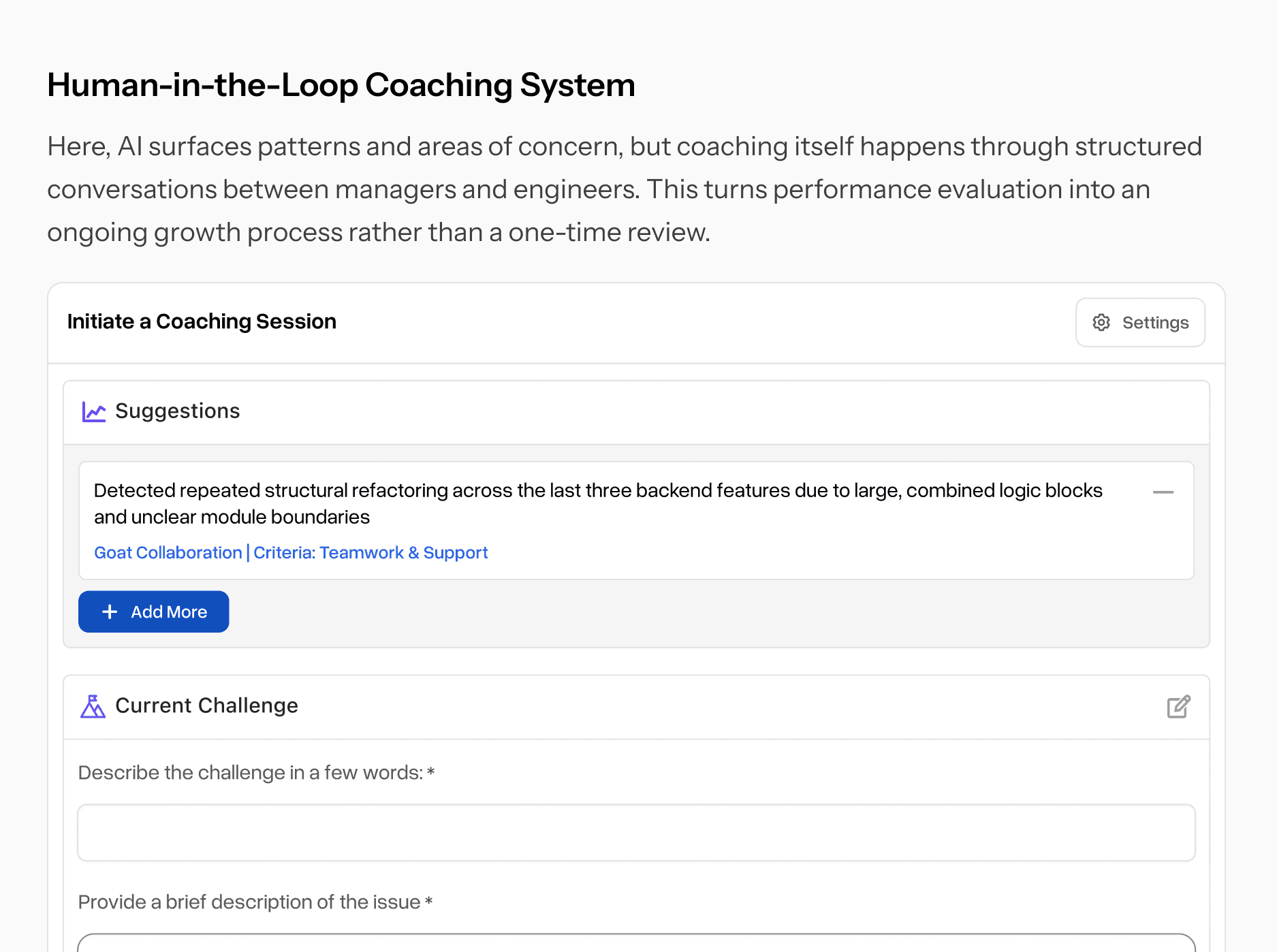Our goal is to make coaching feel natural and effortless: AI should surface issues early and support engineers and managers in taking action through facilitated conversations that provide clarity and guidance.