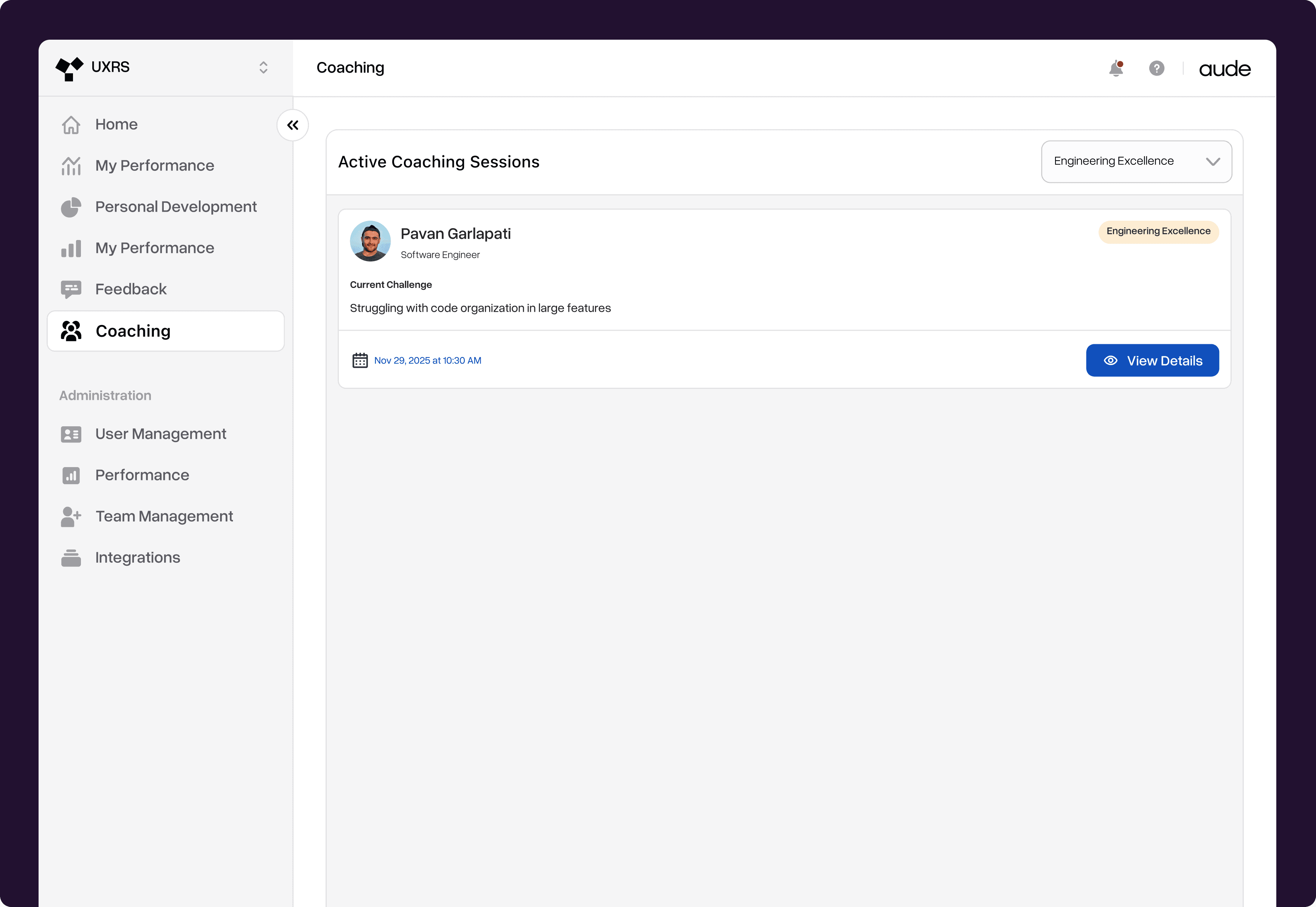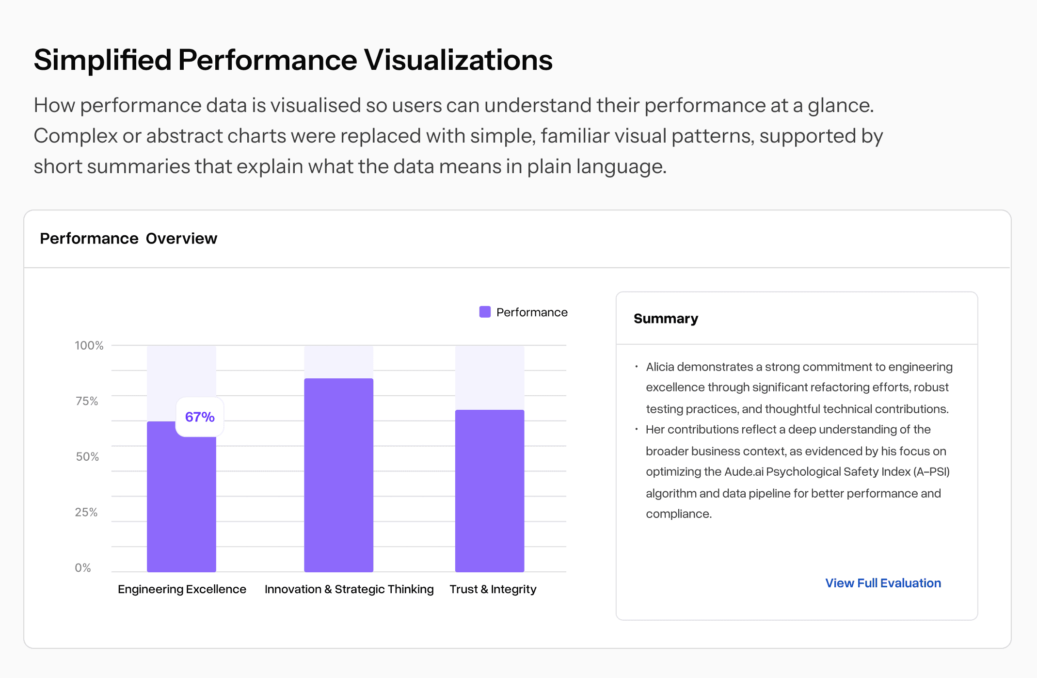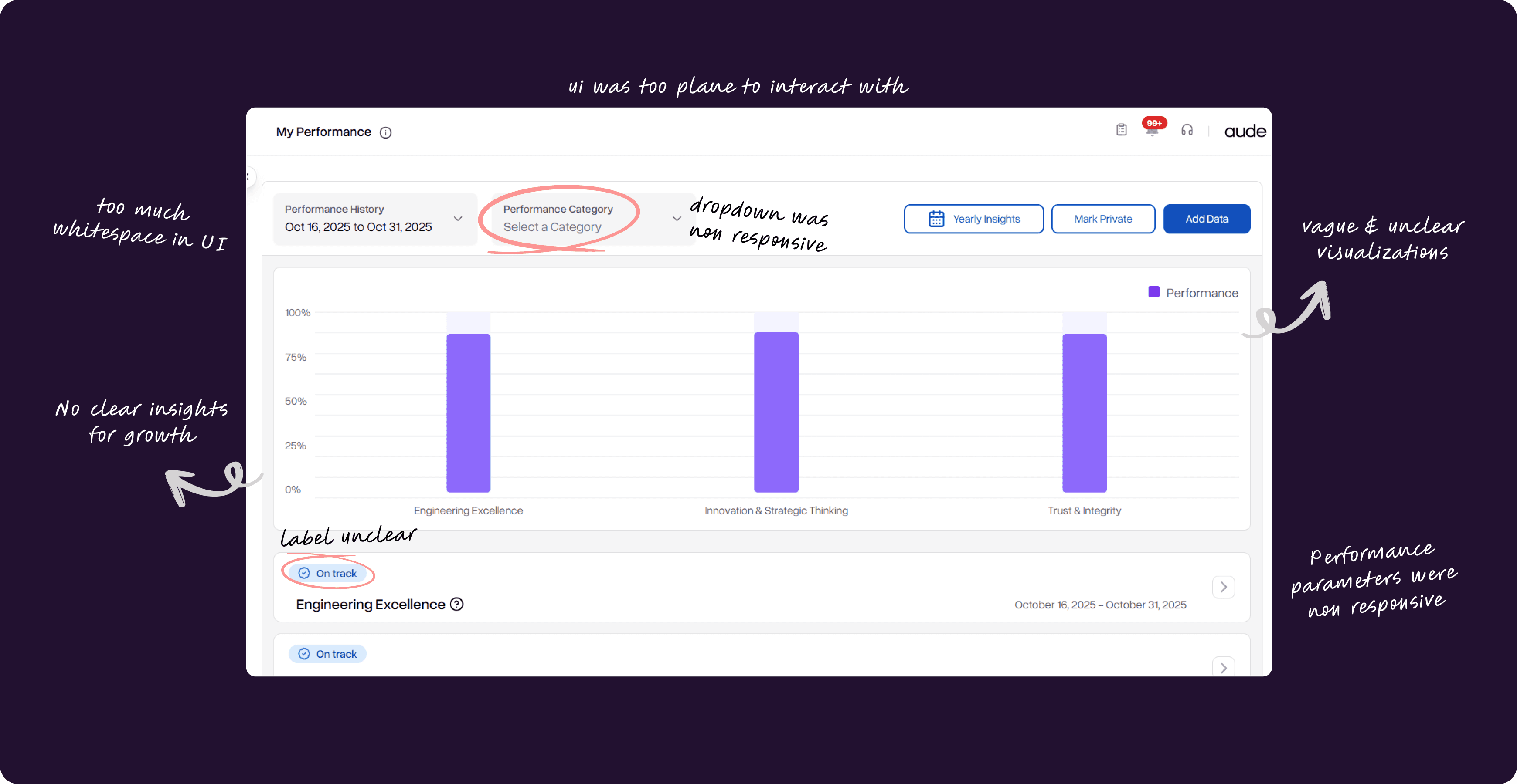At Aude.ai the engineers were struggled to trust and act on AI-generated performance insights by there performance evaluation platform , leading to low adoption. I stepped in to reframe the problem through research, redesign the experience around transparency and actionability, and introduce human-in-the-loop coaching turning insights into meaningful growth for engineering teams.