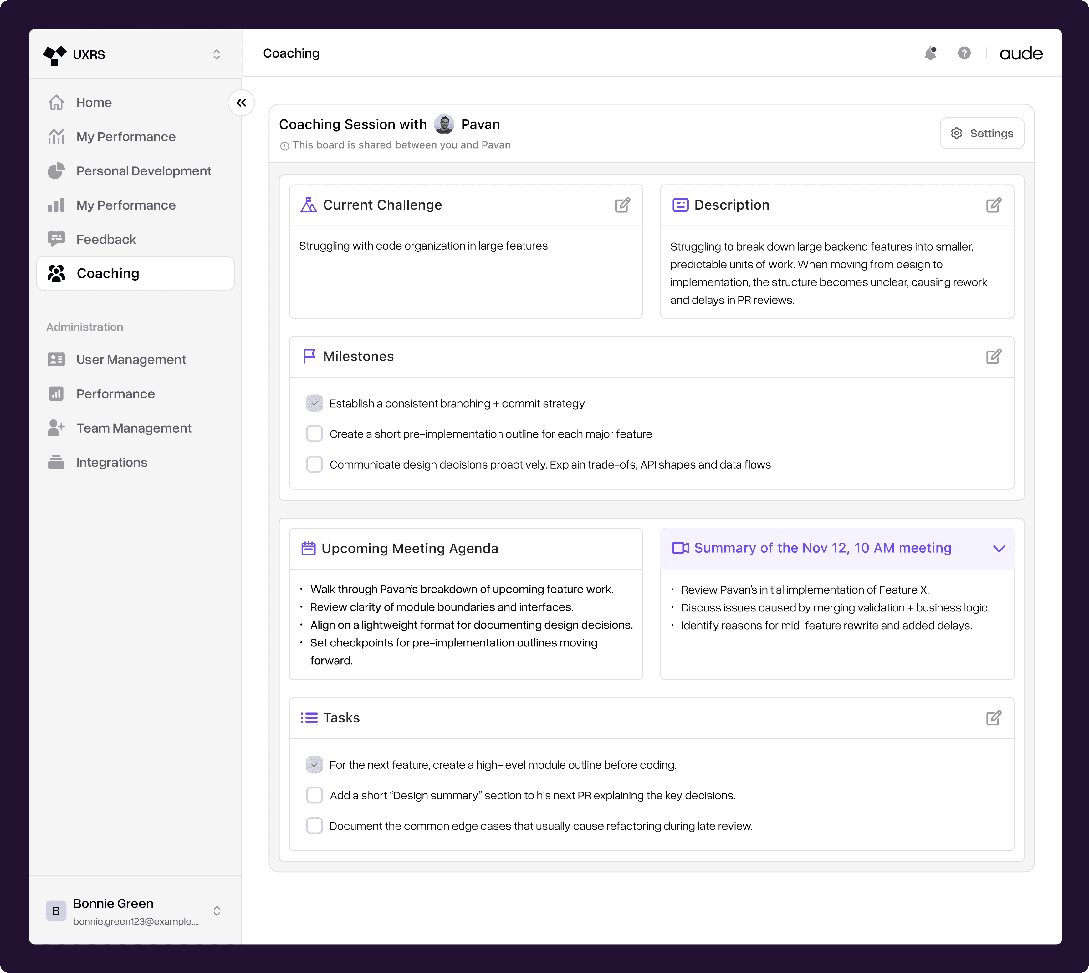 Aude’s AI supports the workflow by suggesting meeting agendas and surfacing relevant patterns from past data. Over time the page becomes a searchable log of conversations and updates, making coaching structured, trackable, and ongoing.