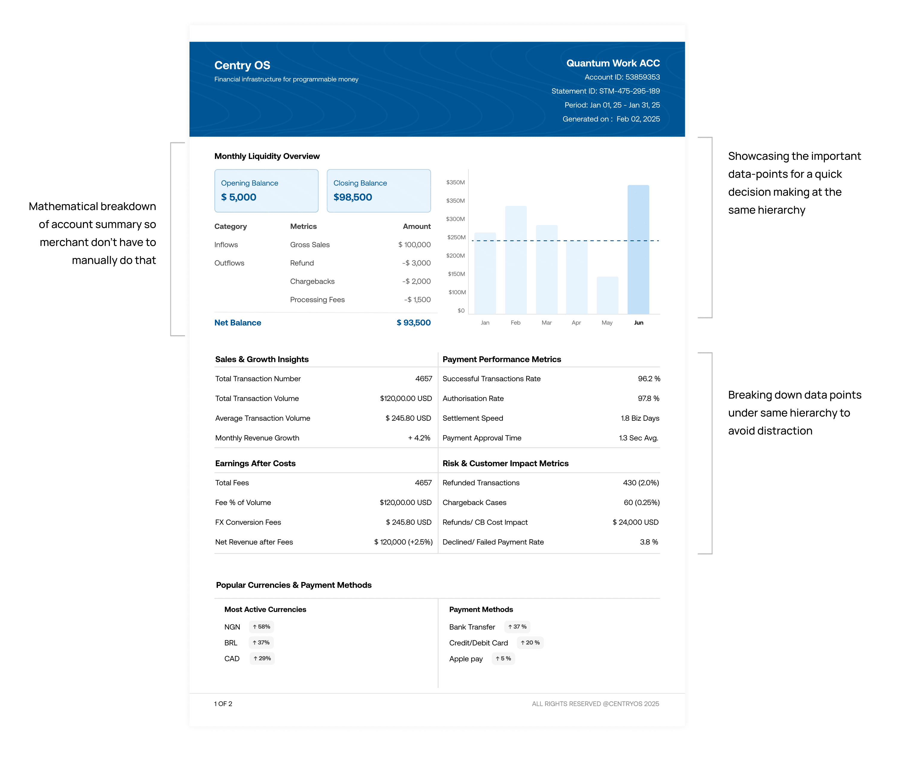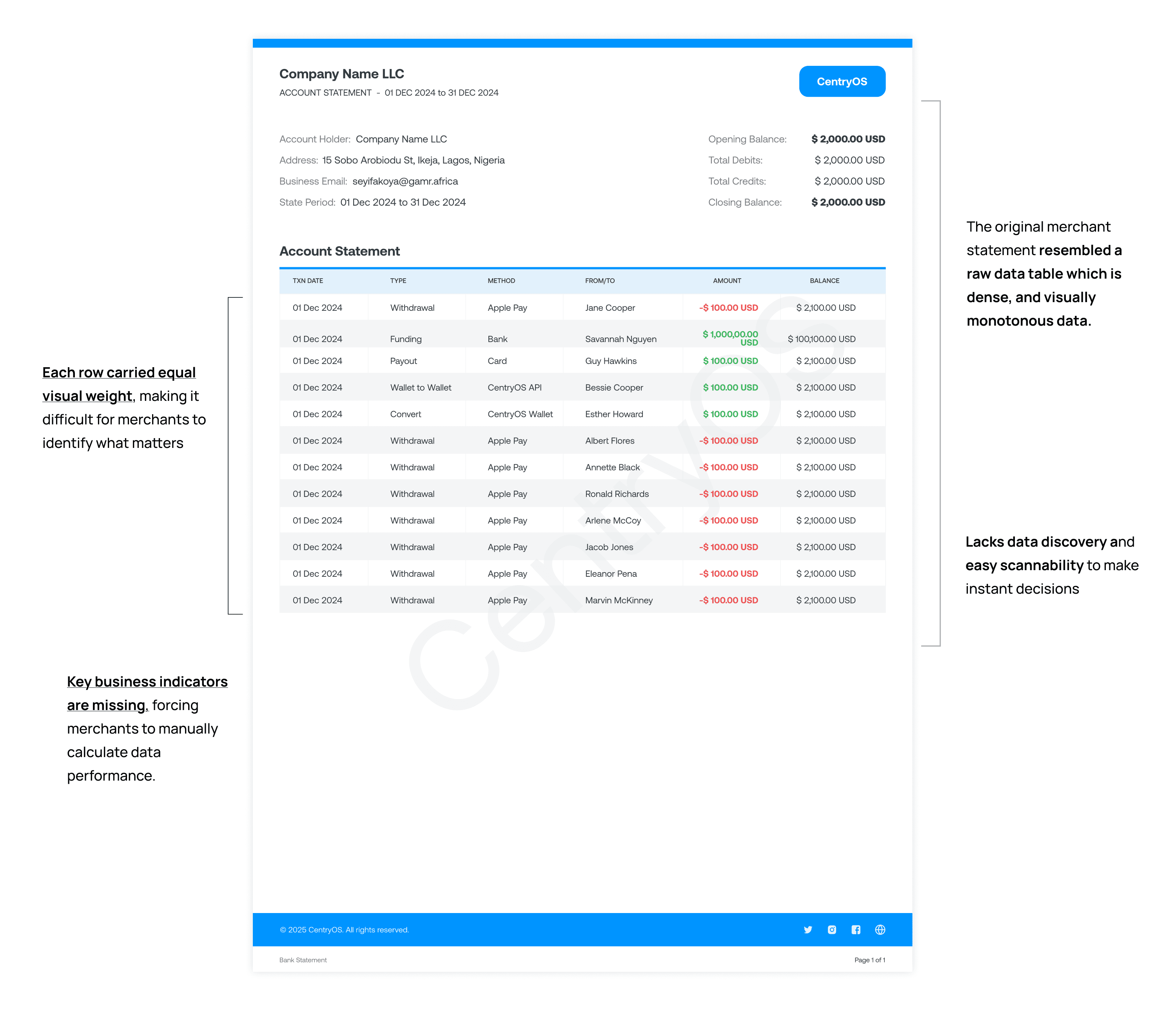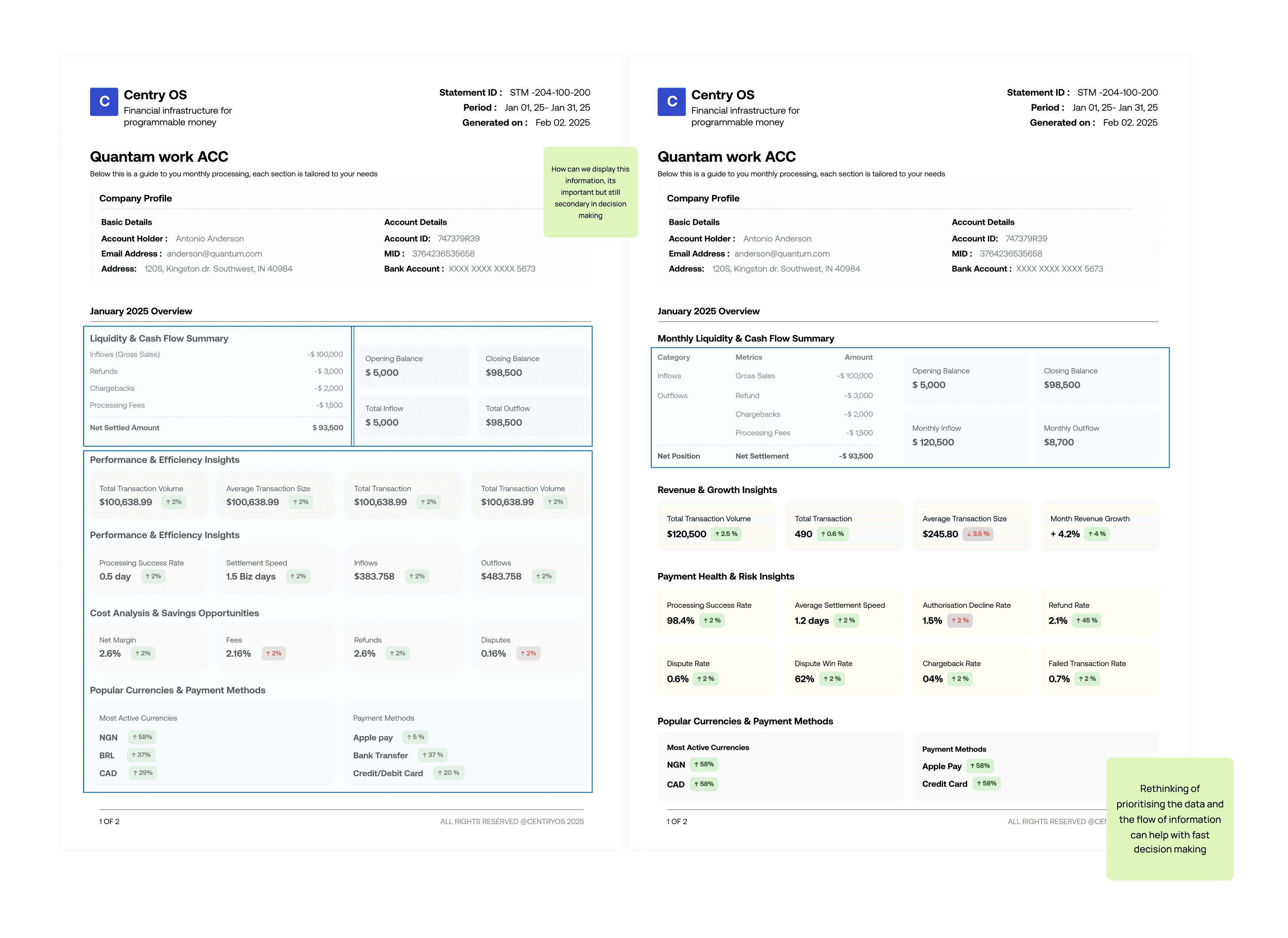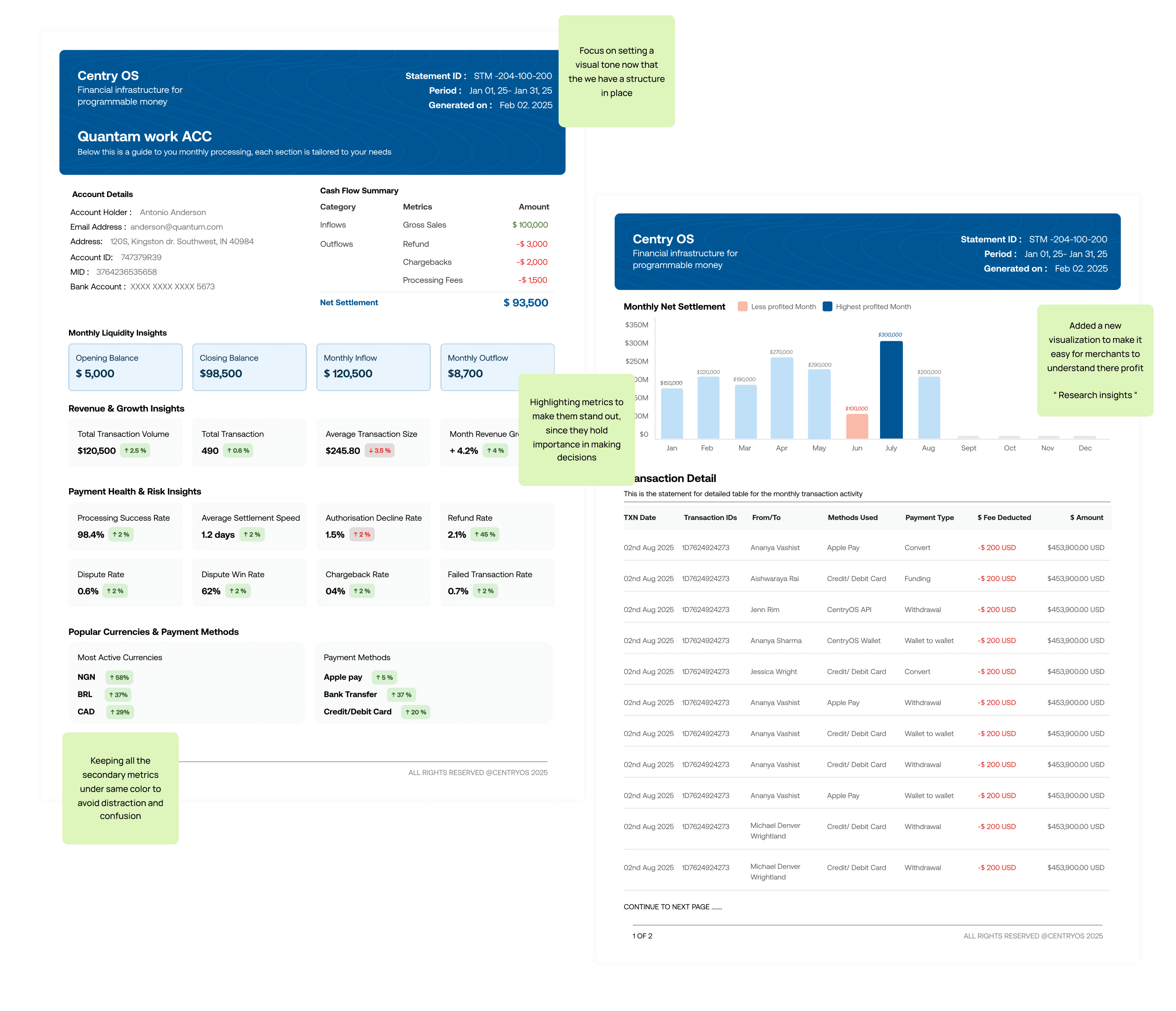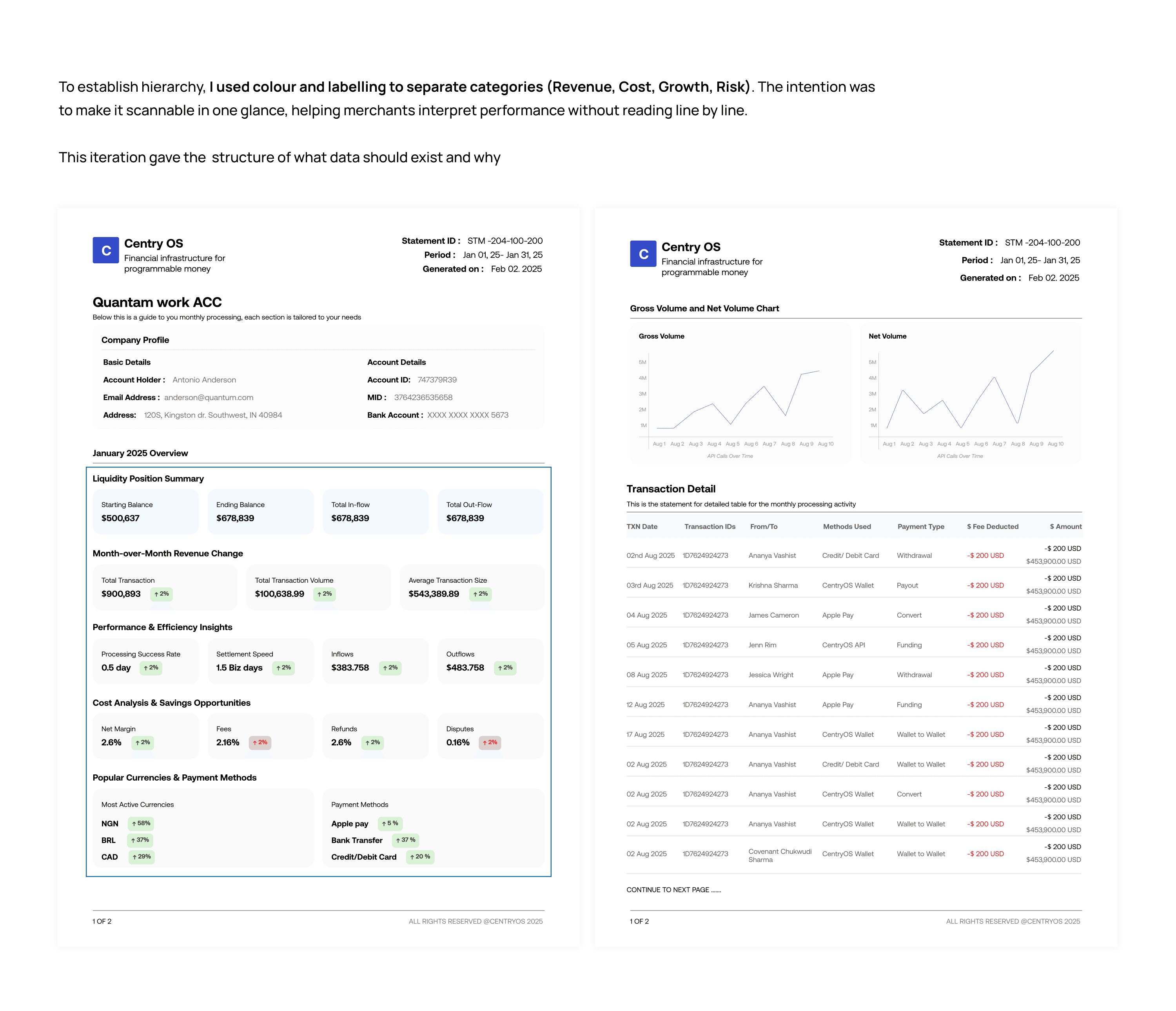 At this stage, my priority was not visuals, but information clarity. The goal was to identify what truly matters to a merchant looking at their financial statement which metrics help them make decisions, and which can be de-emphasized.