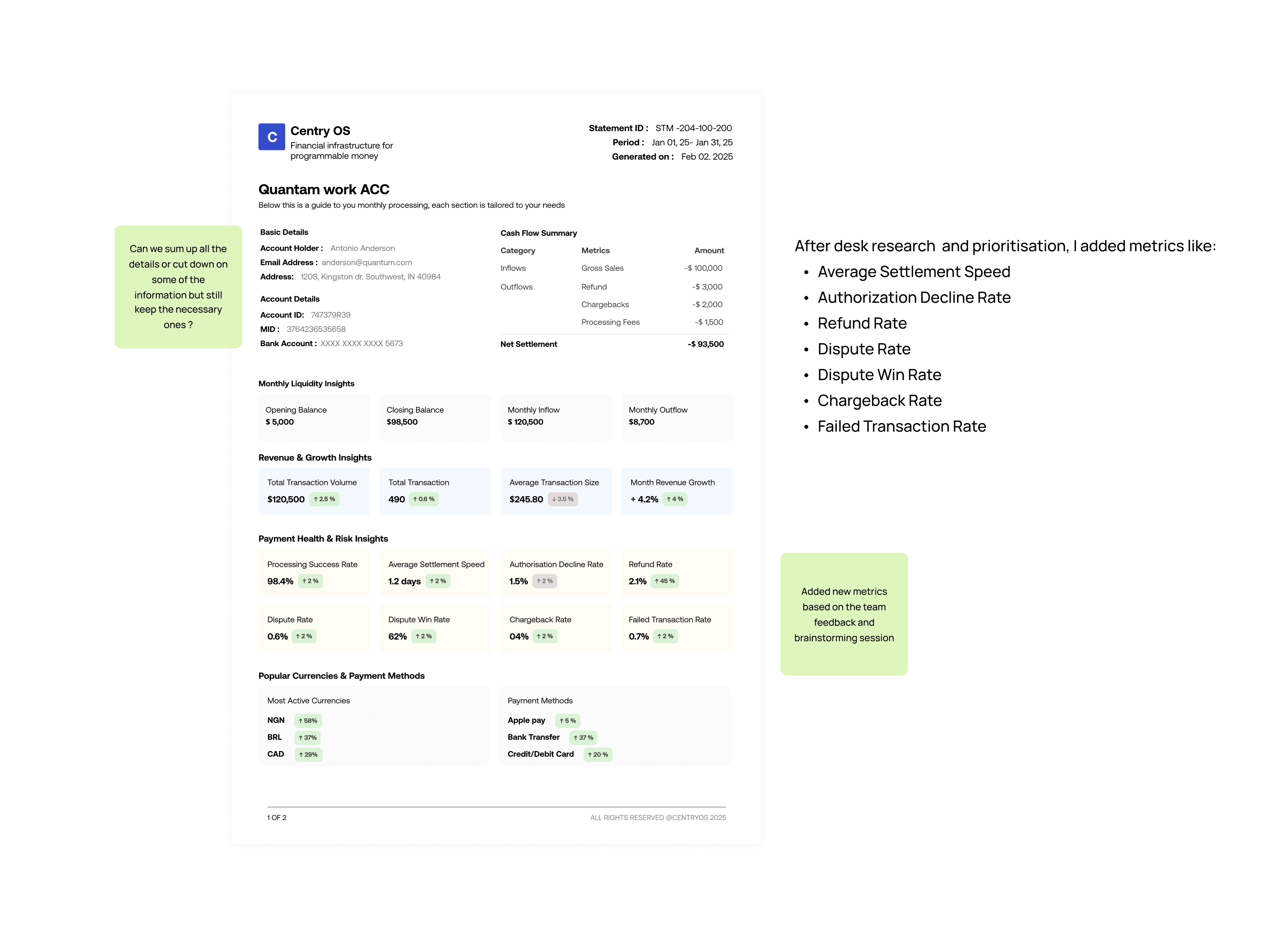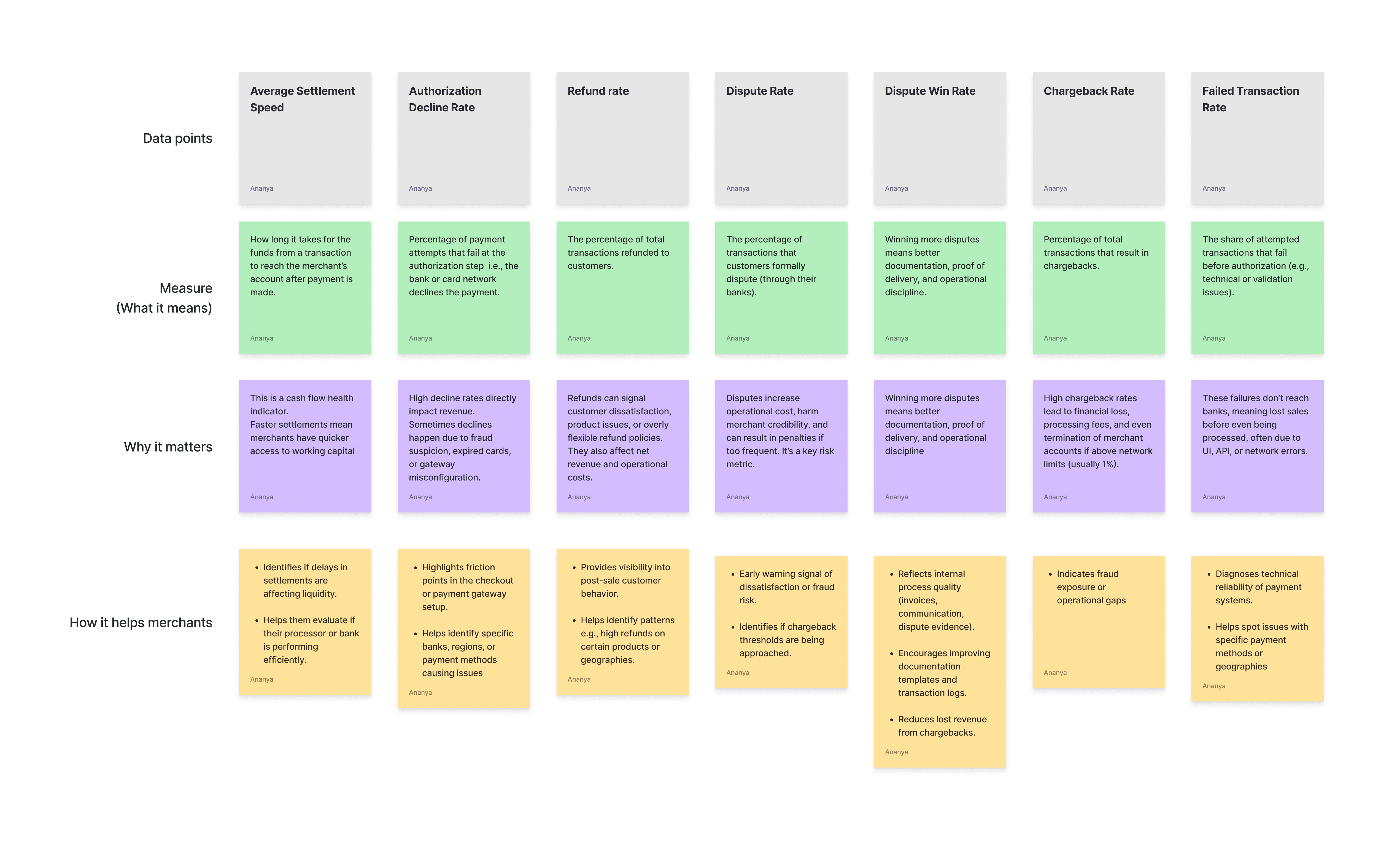 At this stage, new metrics were introduced following business feedback. After discussions with the CEO and design advisor, it became clear that the company wanted to surface payment health and risk metrics to help merchants assess operational efficiency and they wanted to see how merchants respond to such data.