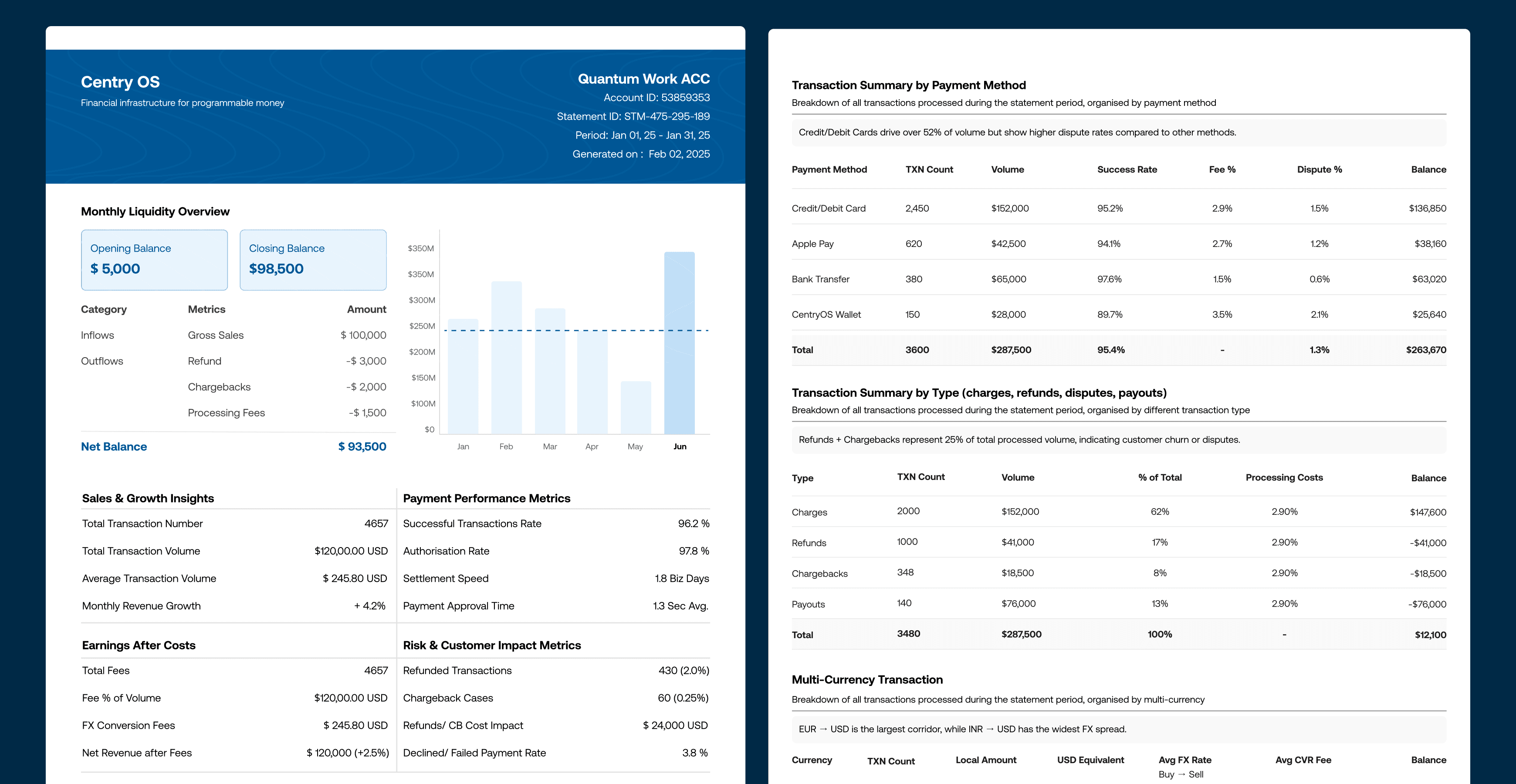 The detailed tables (e.g., transaction logs, multi-currency breakdowns) were still accessible, but no longer required for a meaningful first read.